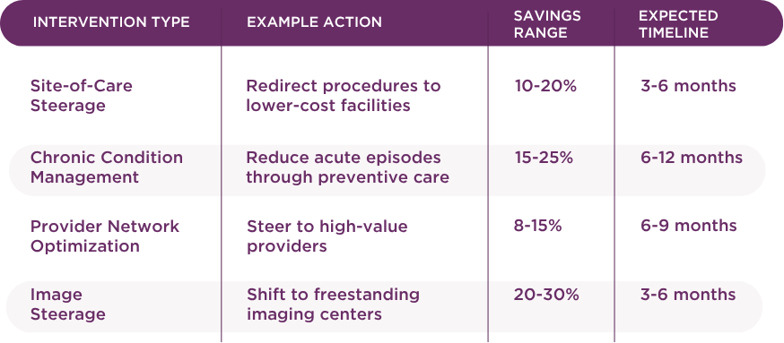 MMM doesn’t just identify overspend, it prescribes action. Each analytic view links directly to specific cost-reduction interventions proven to generate results: